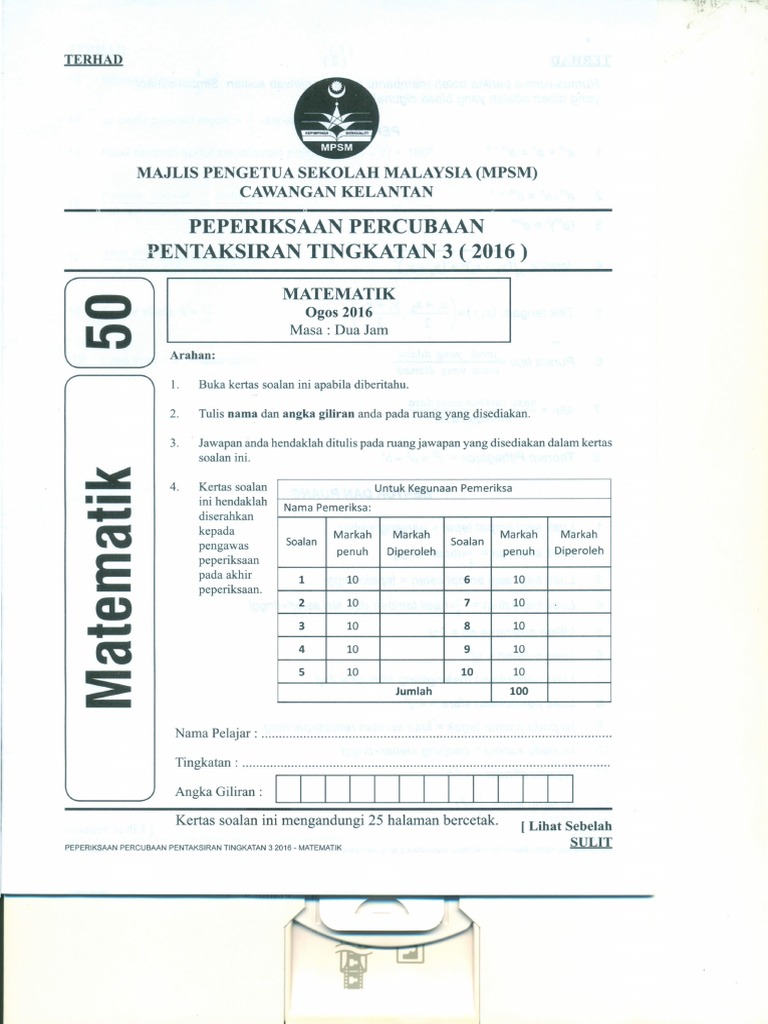 2016 Percubaan Matematik Pt3 Kelantan Dan Skema Pdf