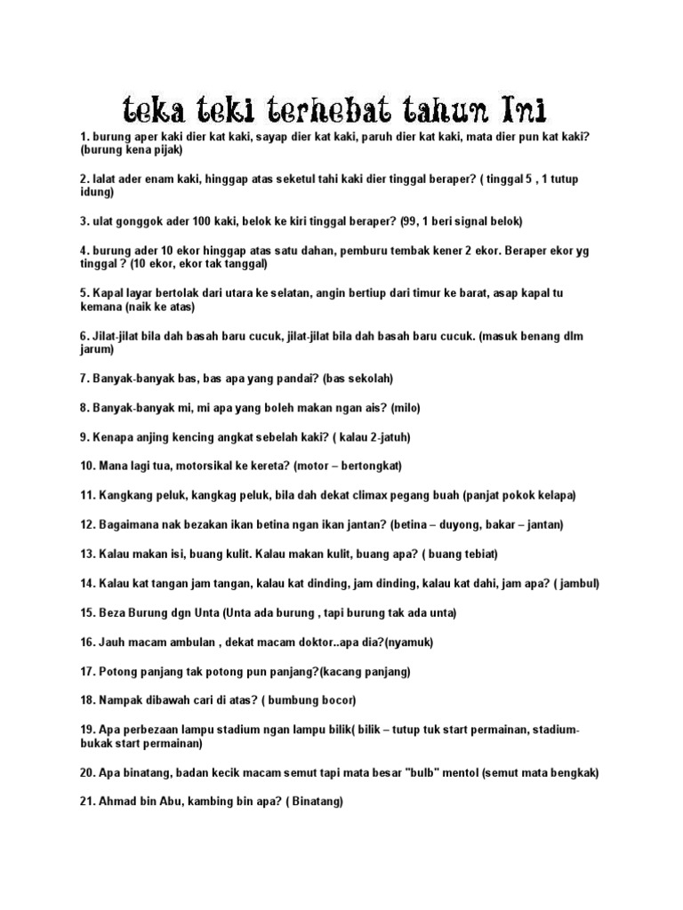 Koleksi teka teki lawak lucu dan kelakar yang kami sediakan disini pastinya akan mencabar minda yang kreatif anda semua. TEKA TEKI MAKANAN MINUMAN. Lihat Lebih Banyak Teka Teki Buah Buahan.