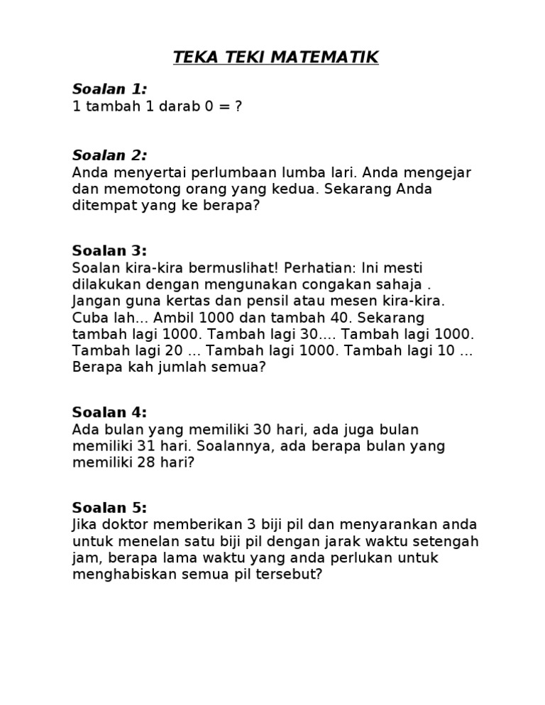 Soalan teka teki matematik. Soalan teka teki dan jawapan soalan teka teki dan jawapan yang susah soalan teka teki dan jawapan lawak soalan teka teki dan jawapan teka. Contoh Soalan Karangan Peribahasa. Jawapan Teka Teki Matematik 1.
