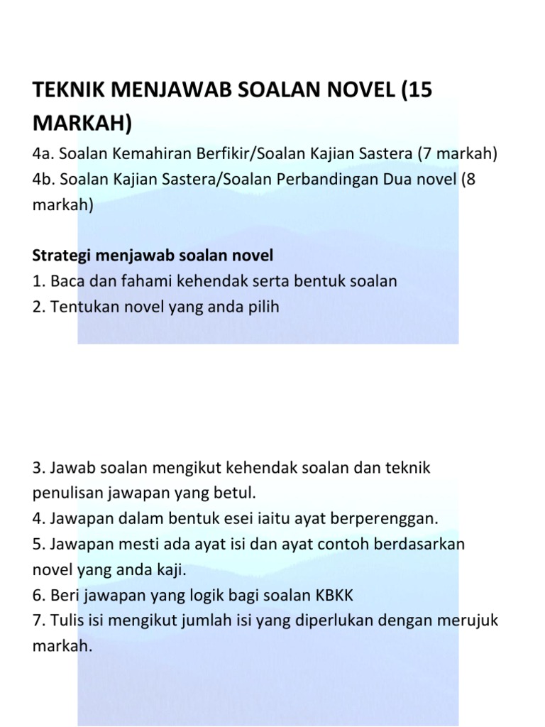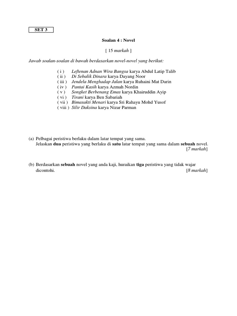 Hanya 1 novel sahaja. Terdapat dua bahagian iaitu a 7 markah dan b 8 markah. Mata Farid dan Amin tertumpu pada skrin di hadapan wanita yang kini menjengilkan mata pada mereka.
