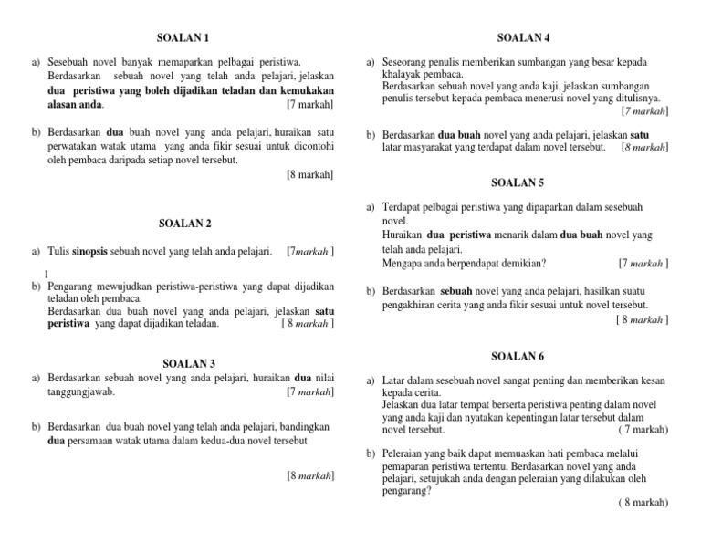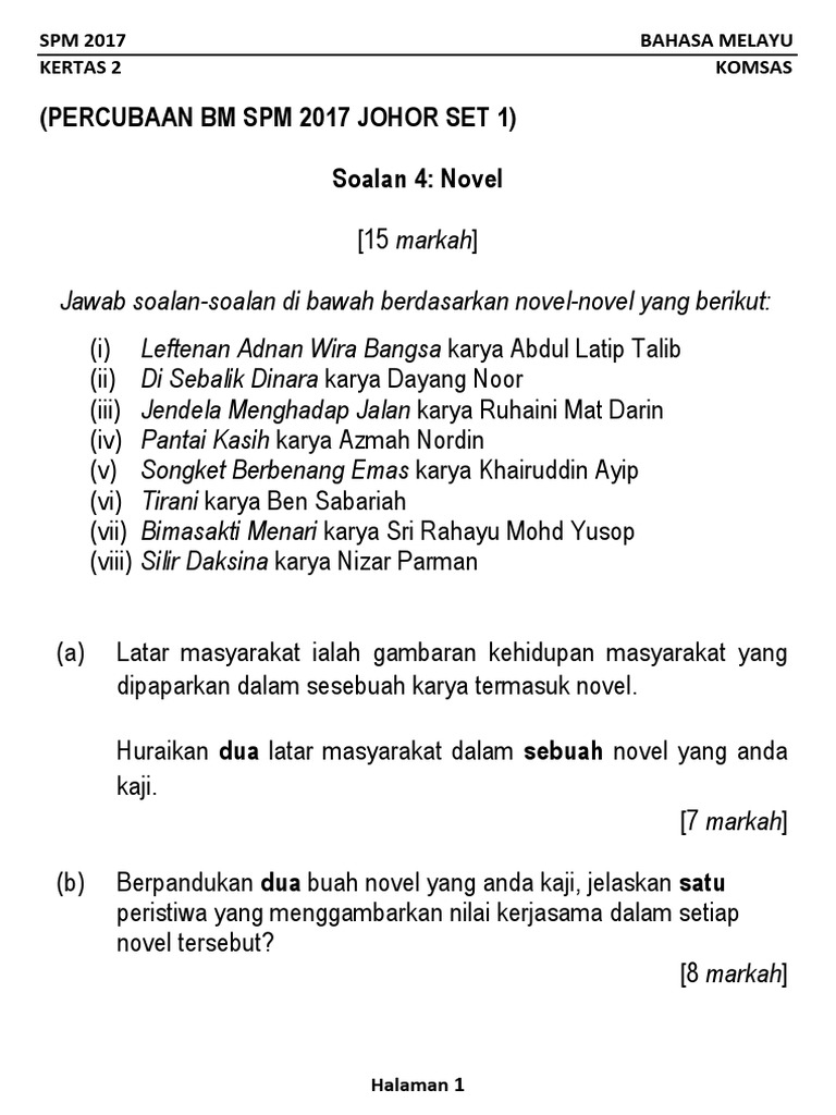 Soalan 8 novel. Check Pages 1-50 of KERTAS 2 SOALAN SKEMA NOVEL PERCUBAAN SPM 2019 SE-MALAYSIA in the flip PDF version. Soalan Percubaan Bahasa Melayu SPM 5 Latar tempat merupakan salah satu aspek penting dalam sesebuah novel. - Soalan 7m 4 Isi 3 Bahasa jawab 1 novel ting45 sahaja - Soalan 8m 6 Isi 2 Bahasa jawab dua buah novel yg telah pelajari ting4 dan 5 click.