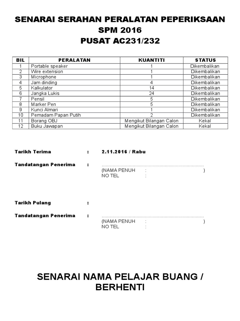 Senarai Serahan Peralatan Peperiksaan Spm 2016 Pdf