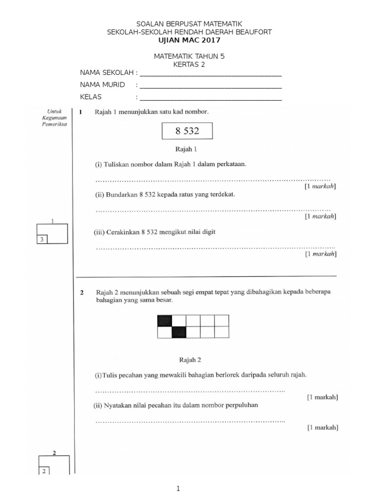 Soalan Matematik Tahun 5 Ujian 1 Bulan Mac 2017 Pdf
