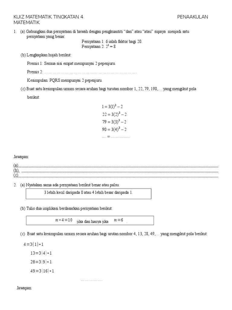 Kuiz Matematik Tingkatan 4 Penaakulan Matematik Pdf