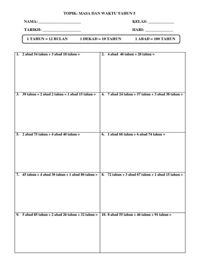 1 minit 60 saat 1 minggu 7 hari 1 abad 10 dekad 1 jam 60 minit 1 tahun 12 bulan 1 abad 100 tahun 1 hari 24 jam 1 dekad 10 tahun 1 kurun 1 000 tahun Bahagi Unit Masa Contoh 1 5 jam 55 minit 5 Nyatakan jawapan dalam jam dan minit. MASA DAN WAKTU TAHUN 3 Carian perkataan. Sistem 12 Jam dan Sistem 24 Jam.