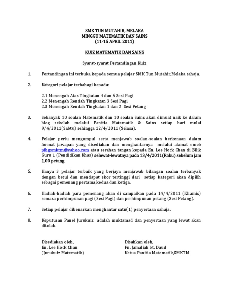 Contoh Surat Rasmi Untuk Anak Tidak Hadir Ke Sekolah. Jawab YA atau TIDAK. Kuiz Kelab Rendah mempunyai 50 soalan yang perlu dijawab dalam masa 60 minit 3600 saat Peserta hanya mempunyai satu 1 kali penyertaan sahaja.
