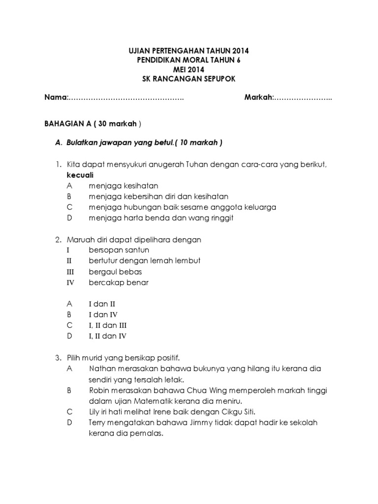 PEPERIKSAAN PERTENGAHAN TAHUN PENDIDIKAN MORAL TAHUN 6 Nama. Pin On Akhir Tahun P Moral. Ujian Bulanan 1 Pendidikan Moral Tahun 6.