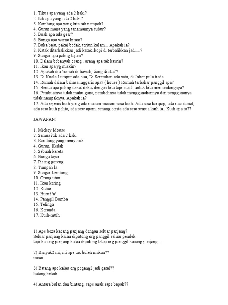 Tujuan utama soalan teka teki jenis ini adalah untuk memberi pengetahuan baru kepada pembaca dan seterusnya meningkatkan pengetahuan am pembaca. SoalanBinatang ape power Karate. Kalau Tuan bijak bestari apa yang naik tak pernah turun.