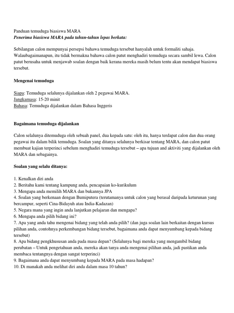 Untuk mendapatkan biasiswa kebiasannya anda perlu tahu soalan temu duga biasiswa. Soalan ini sebenarnya ditanya untuk mereka lebih tahu mengenai. Soalan temuduga SPA yang sering ditanya oleh panel penemuduga kepada calon berkisar kepada beberapa aspek seperti.