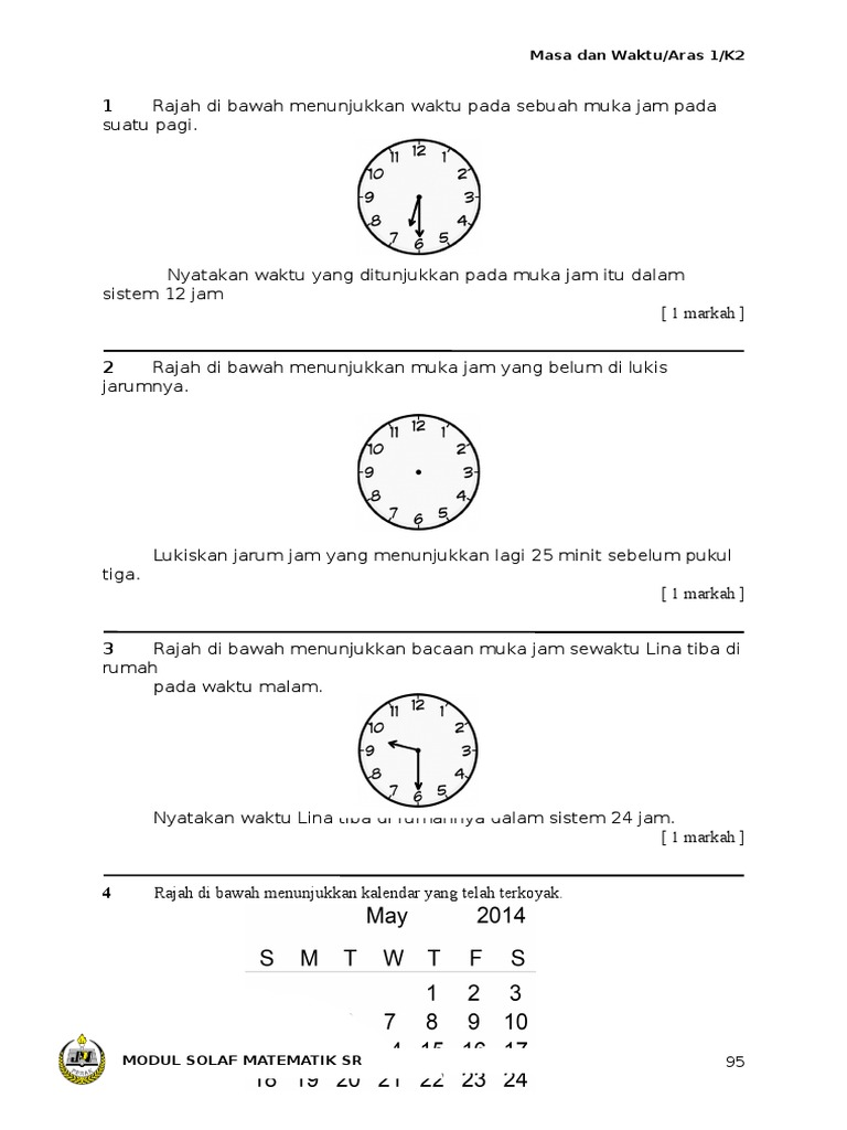 Tuliskan waktu yang ditunjukkan itu dalam sistem 24 jam. Modul Khas Matematik Bestari Tahun 3 MASA DAN WAKTU HARI. KOLEKSI 1995-2010 TOPIKAL KERTAS 2 JPN KEDAH MATEMATIK RENDAH 2 5 Jam di sebelah menunjukkan waktu waktu Ali pulang dari sekolah.