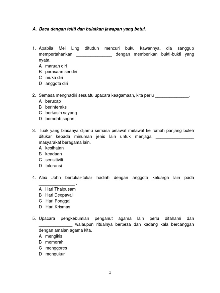 Soalan p.moral tahun 5. Semoga bermanfaat kepada guru. Berpuasa selama sebulan dalam Ramadan Bsujud di hadapan kitab suci Granth Sahib CSujud di hadapan patung Buddha Dmembasuh kaki sebelum memasuki. Moral - Tahun 5.