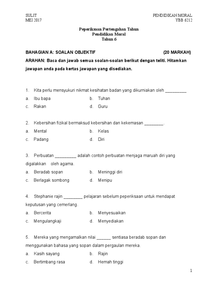 Soalan Objektif Pendidikan Moral Tahun 6. Sama-sama bantu membantu antara satu sama lain. Penganut agama ini diwajibkan sembahyang lima kali sehari.